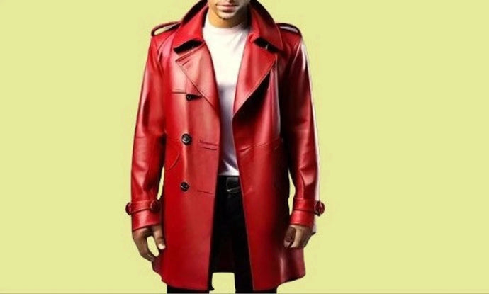 Brand New Men's Red Trench Leather Long Coat. Real Soft Sheepskin Leather Jacket