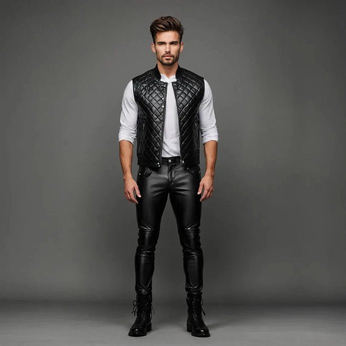 New black quilted biker leather vest for men. Genuine soft lambskin leather jacket...