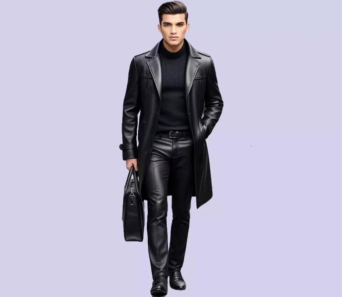 New Mens Black Trench Leather Long Coat. Genuine Soft Lambskin Leather Jacket XL