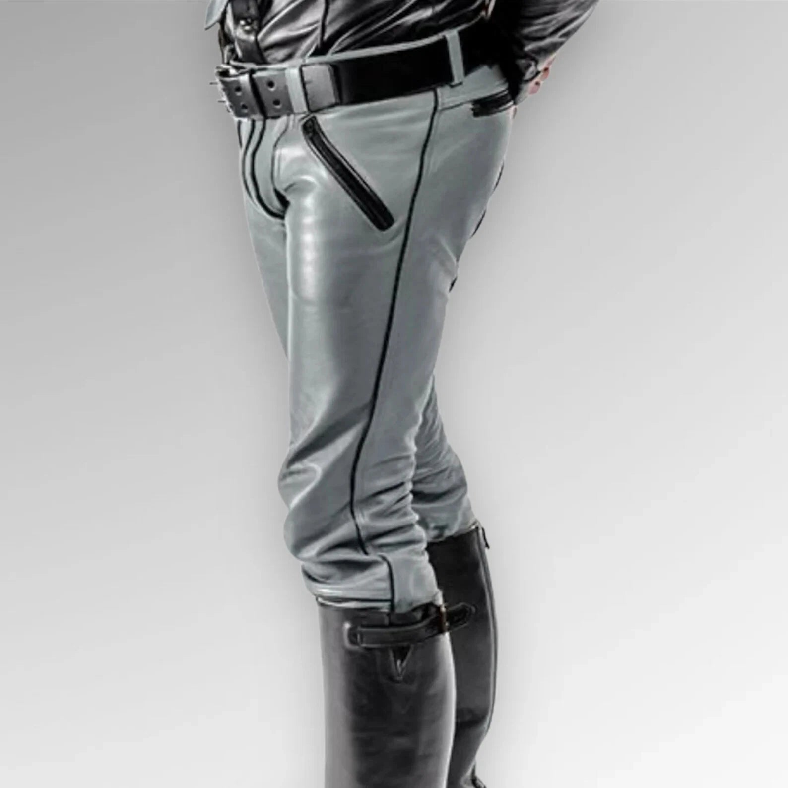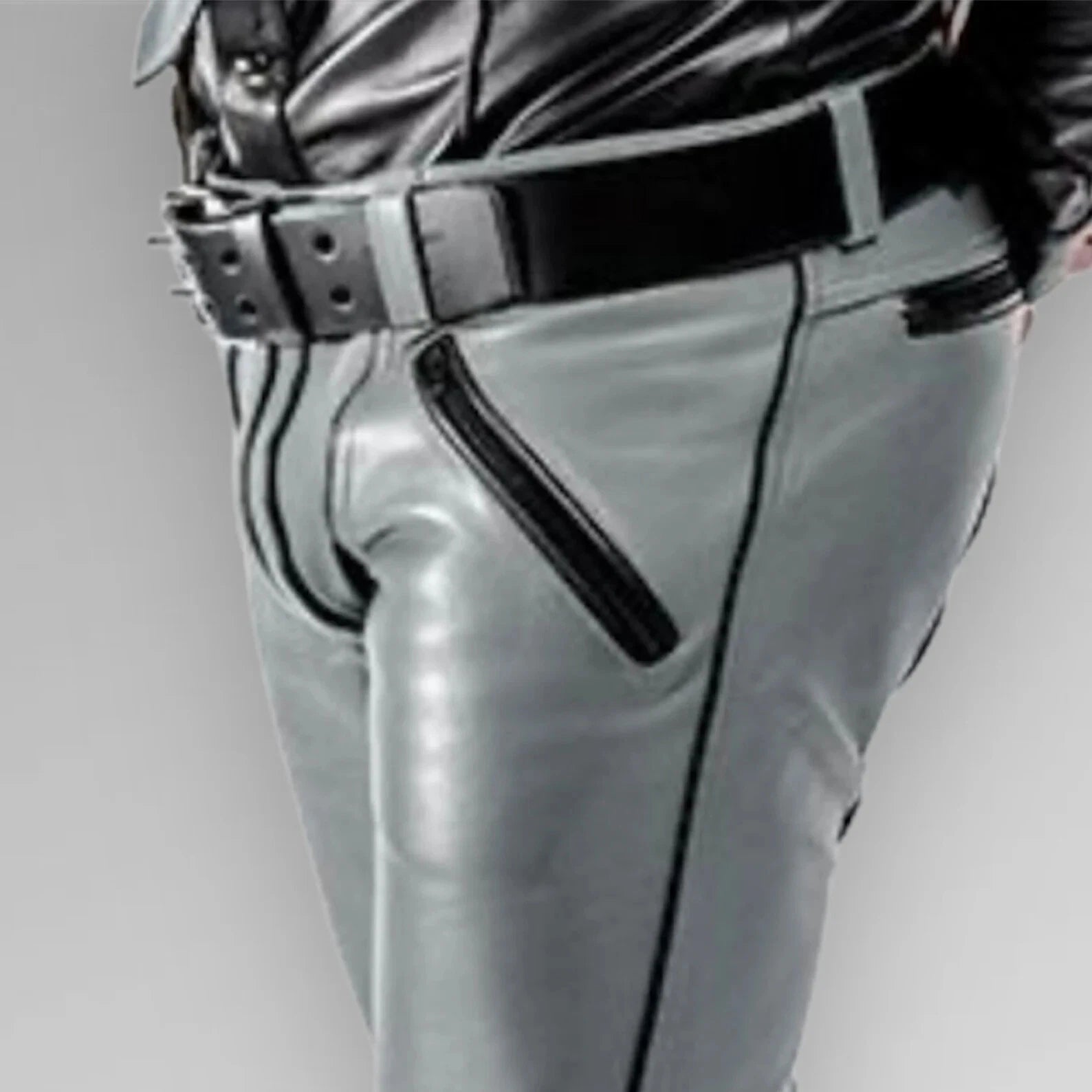 Men's Grey genuine Biker leather is a sophisticated and rugged type of pants made from real leather in various shades of red. They are designed to fit snugly around the legs, creating a flattering and stylish silhouette, and may feature decorative stitching, zippers, or other details.