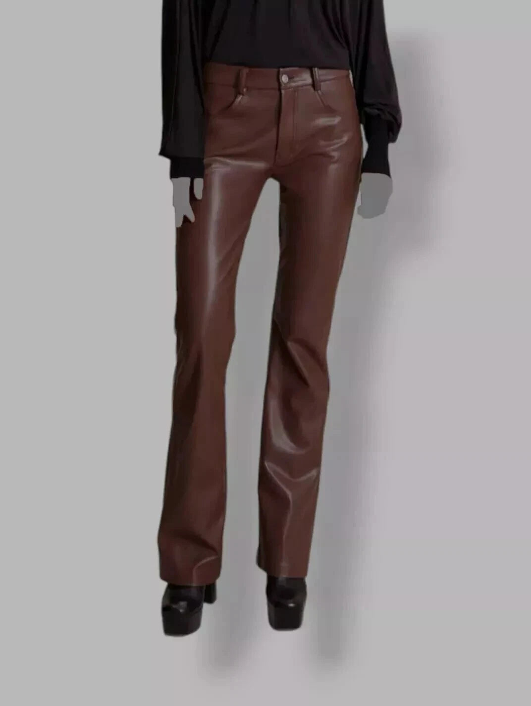 A women's genuine brown leather pant with bell bottom is a stylish and unique piece of clothing made from high-quality, real leather. These pants feature a classic bell bottom silhouette, flaring out at the bottom of the leg, creating a flattering and retro-inspired look.