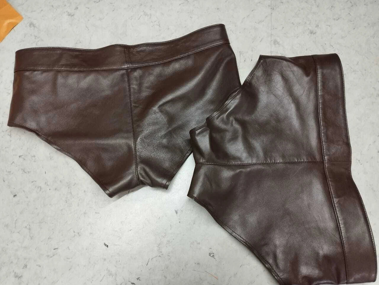 Brand New Men's Brown, Stripes Leather Briefs. Handcrafted from Genuine Soft Sheep leather. Men's Real leather breathable Underwear and briefs. Upper layer leather with the inner covering of satin. Front Zipper With Button Closure and Amazing Elastics that are durable and overall beautifully designed.