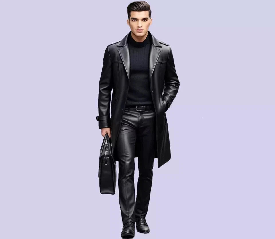 This men's black genuine leather long coat is a sophisticated and stylish piece of outerwear that can add a touch of class to any outfit. The coat is typically made from high-quality leather, which is known for its durability and timeless appeal. Button Closure Trench Coat.